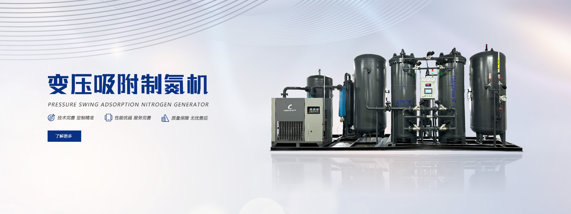 碳分子篩變壓吸附(Pressure Swing Adsorption,簡稱PSA)制氮裝置,是一種新型的空氣分離的高新技術設備,以壓縮空氣為原料,碳分子篩為吸附劑,采用變壓吸附流程制取氮氣。
